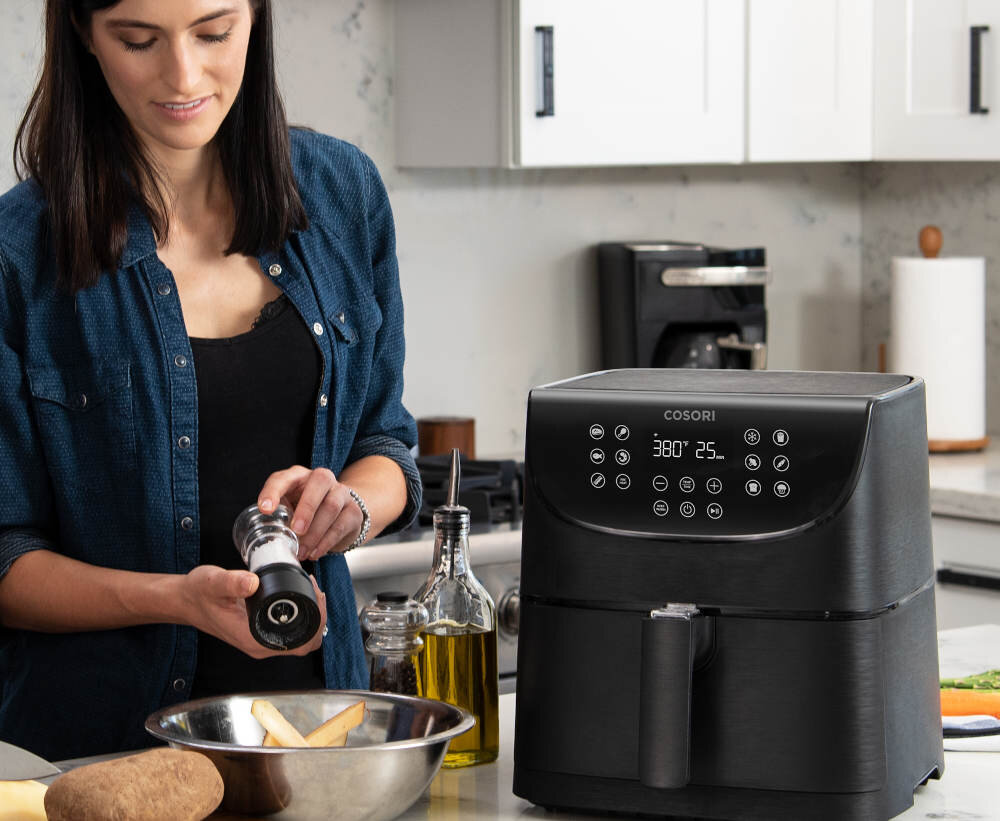 Frytkownica beztłuszczowa COSORI CS158-AF-RXB została wyposażona w pojemny, kwadratowy kosz na potrawy, do którego zmieści się nawet 3kg kurczaka. Moc urządzenia to 1700W, skraca ona czas gotowania/pieczenia, tym samym oszczędzając energię elektryczną.