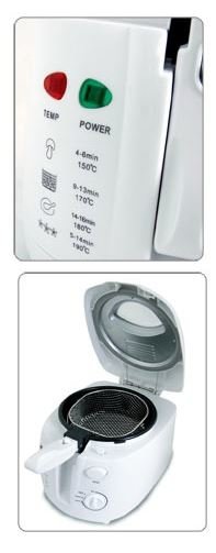 | Zbiornik ma pojemność 1,6 litra. Dzięki wymiennemu filtrowi, który pochłania aromaty, nie odczuwa się intensywnego zapachu smażonego oleju. Dwie lampki kontrolne sygnalizują zasilanie i gotowość do smażenia, a termostat pozwala na płynną regulację temperatury. |