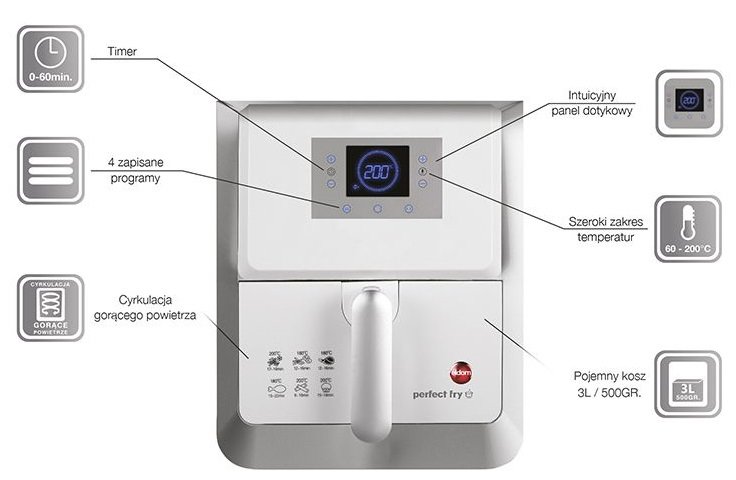Urządzenie jest nowoczesne i stylowe oraz bardzo łatwe w użyciu - posiada czytelny wyświetlacz LCD, dotykowy panel sterowania, 4 zapisane programy oraz regulację temperatury w zakresie 60°C–200°C i 60-minutowy TIMER z sygnalizacją zakończenia pracy. Wygodę i bezpieczeństwo zapewnia nienagrzewający się uchwyt oraz ochrona przed przegrzaniem. MFC1000 pozwoli Ci przygotować nie tylko frytki, nuggets'y z kurczaka czy steki, lecz również ciasta i pizzę! W zestawie - obok pojemnego koszyka (3l) i rusztu , który ułatwia grillowanie - znajdują się także formy do ciasta i pizzy.