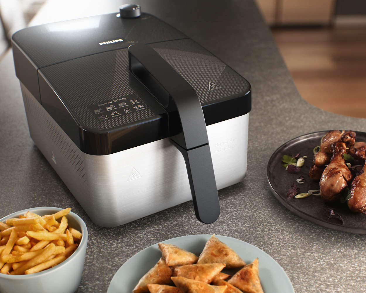 | Smaczne i zdrowe smażone jedzenie o znacznie mniejszej zawartości tłuszczu Innowacyjne urządzenie wielofunkcyjne z technologią Rapid Air nadaje się nie tylko do smażenia. Możesz w niej także grillować, a nawet piec ulubione potrawy — wszystko to w jednym urządzeniu. |