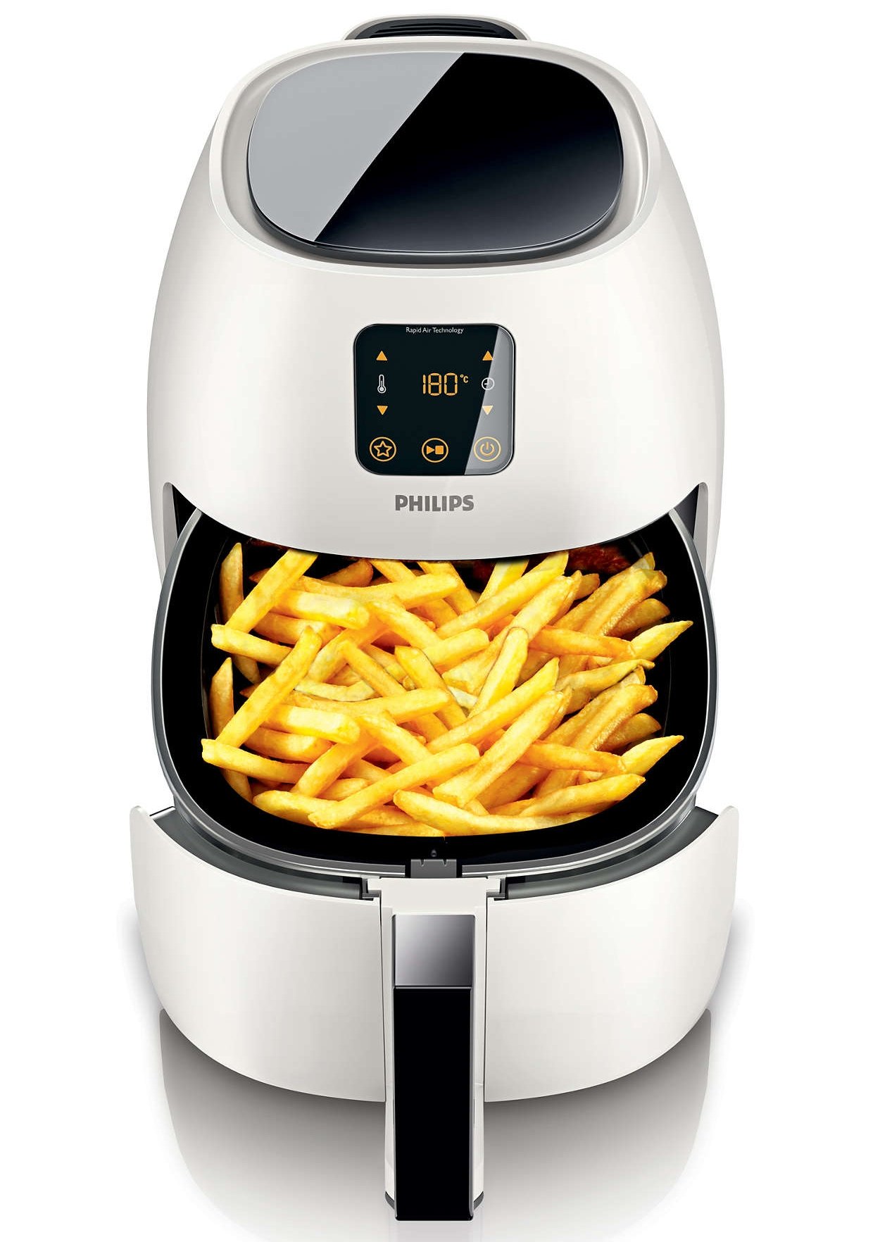 | Pyszne frytki zawierające nawet o 80% mniej tłuszczu!* Z technologią Rapid Air zapewniającą doskonałe efekty -Urządzenie o niskim zużyciu tłuszczu -Airfryer 1,2 kg -Biały |
