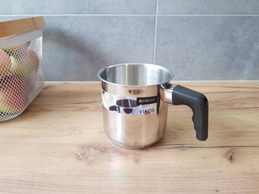 Garnek AMBITION Vikos to klasyczny garnek, który ma prosty kształt ścianek i wygodny, nienagrzewający się uchwyt z czarnego tworzywa (bakelit). Wykonany z wysokiej jakości stali nierdzewnej o grubości ścianek 0,5 mm.