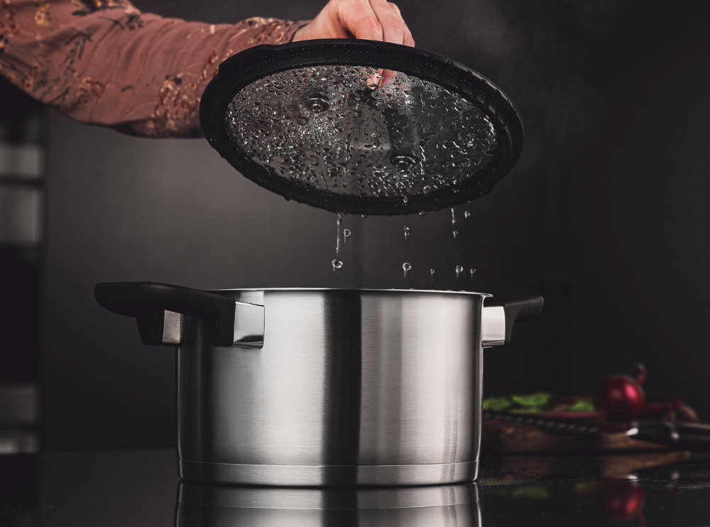 Pokrywa garnka została wykonana tak, by użytkowanie jej było komfortowe i bezpieczne. Ma sita z drobnymi i grubymi oczkami, co ułatwia odcedzanie makaronu czy ziemniaków. Rant garnka wyposażono w sylikon, co chroni Twoje dłonie przed wszelkimi urazami i poparzeniami, a także przed przypadkowym obiciom struktury naczynia.