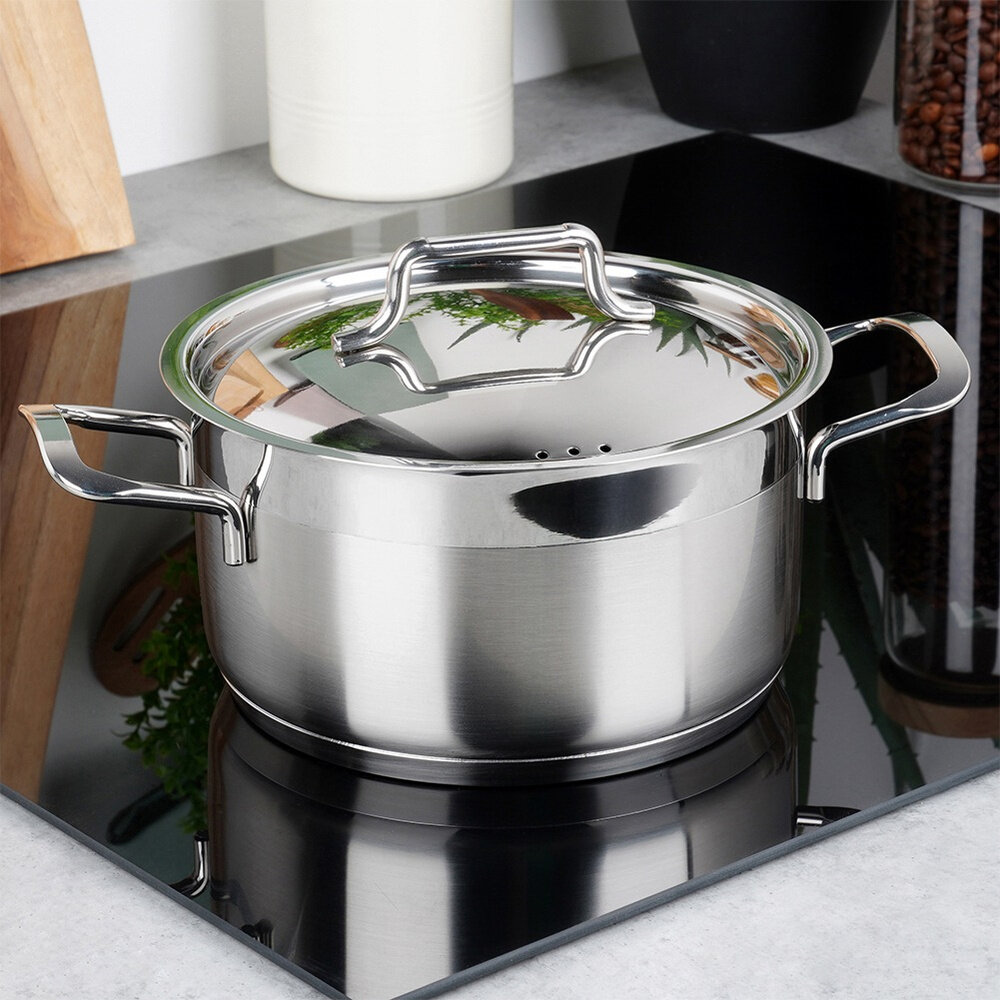STALOWY - Najwyższej jakości stal szlachetna 18/10 - matowa z dodatkowym pasem połysku w górnej zewnętrznej części naczynia. Grube i solidne ścianki boczne naczynia. Garnek jest ciężki i masywny.