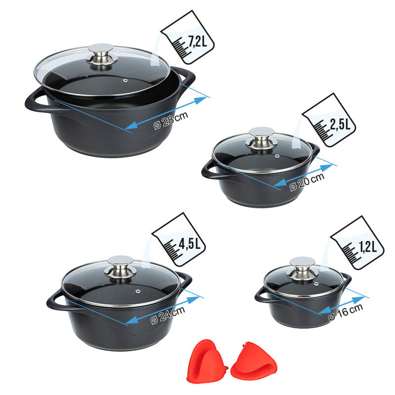 | Zawartość zestawu: | 1 x Garnek 16 cm, 1 x Garnek 20 cm, 1 x Garnek 24 cm, 1 x Garnek 28 cm, 2 x silikonowa rączka do chwytania garnka, 4 x Pokrywka |