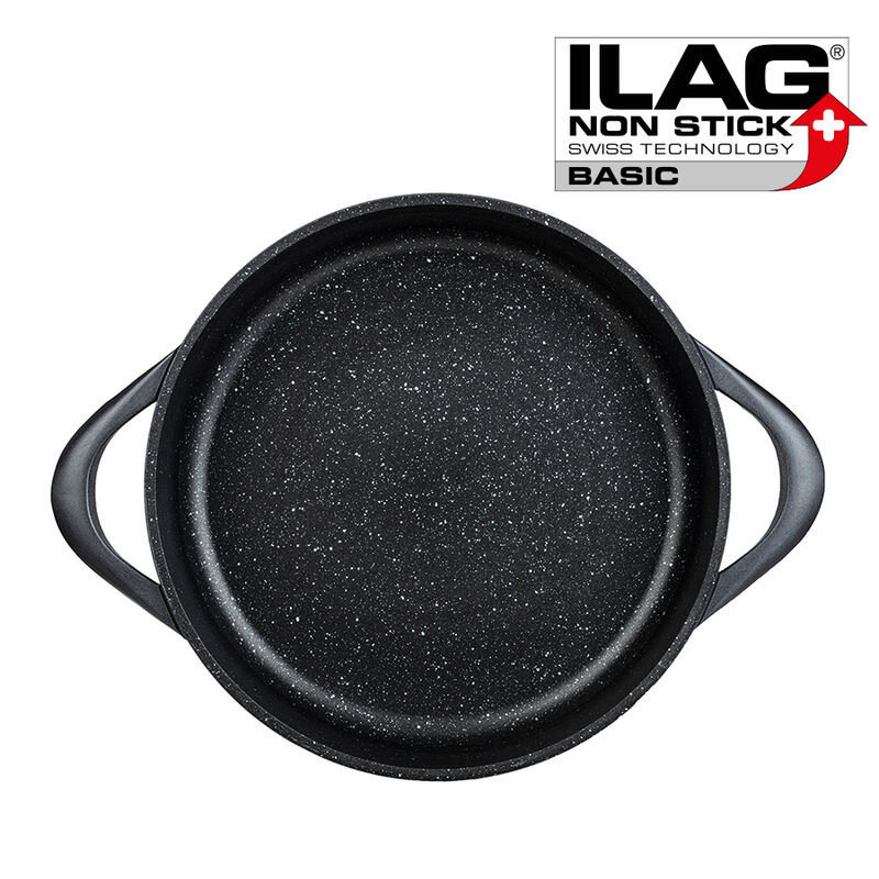 Nieprzywierające i trwałe powłoki wykonane szwajcarską technologią ILAG Basic, pozwalają na łatwe i szybkie mycie naczyń po zakończonym gotowaniu, bez konieczności namaczania i szorowania z resztek jedzenia.