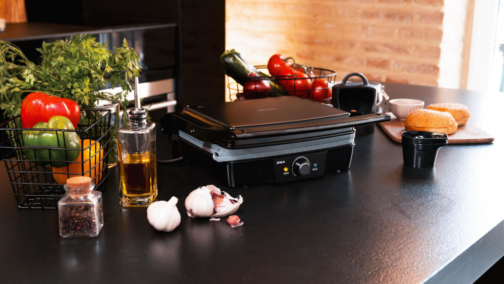 Duża płyta grzewcza o wymiarach 29,4 x 22,9 cm oferuje wystarczająco dużo miejsca do jednoczesnego przygotowania kilku potraw. Dodatkowo możliwość otwarcia grilla do kąta 180° pozwala na używanie go jak klasycznej patelni lub grilla, co zwiększa jego funkcjonalność i wszechstronność w kuchni.