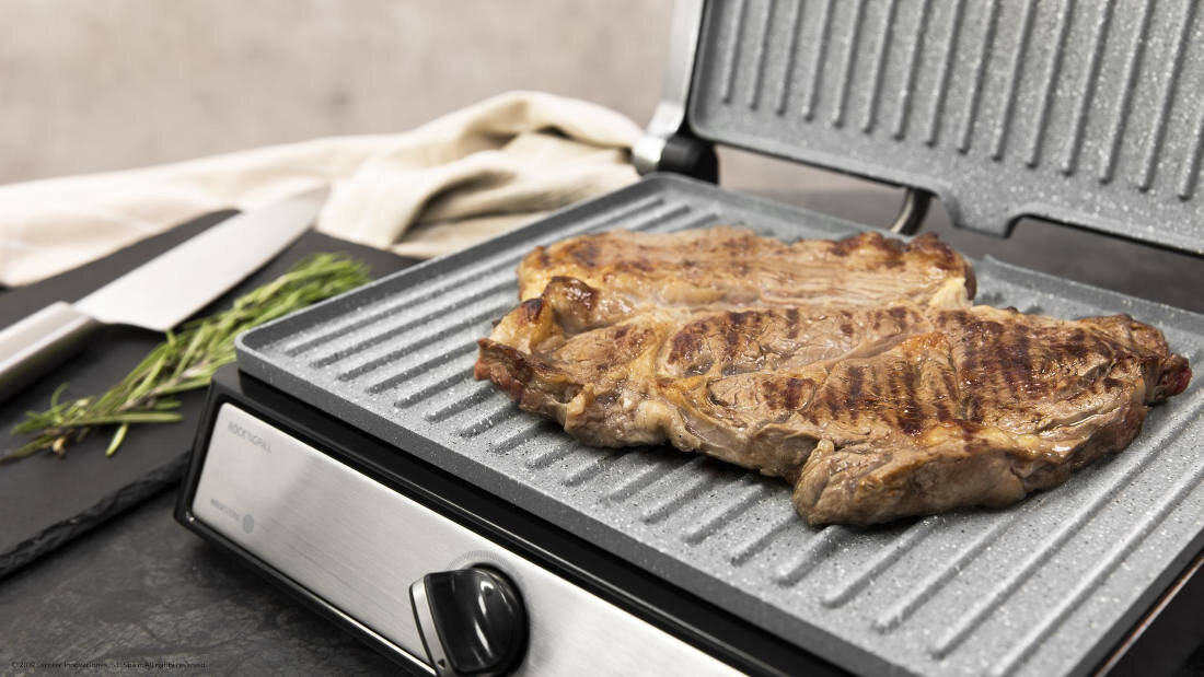 | Funkcje dodatkowe: | Duża płyta grzewcza, Kamienna płyta grzejna, Regulacja temperatury, Rozłożenie grilla na płasko, Termostat, Wyjmowana tacka |