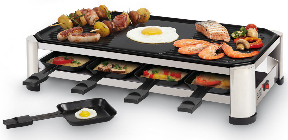 W zestawie znajduje się 8 małych patelni Raclette, które pozwolą na urozmaicenie przyrządzanych dań. Na patelniach można przygotować osobne przystawki – sery, jajka, chrupiące bułeczki czy sosy.