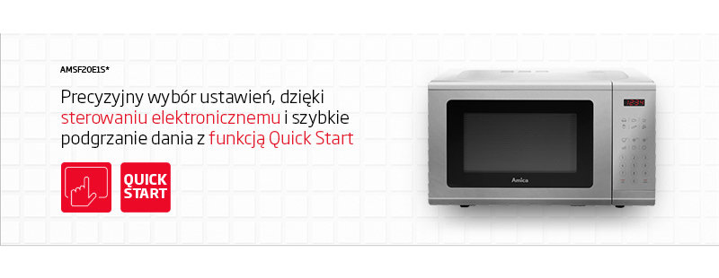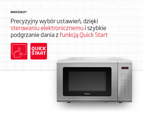 Zdrowe i smaczne dania w krótkim czasie? Teraz to możliwe, gdyż w kuchenkach mikrofalowych Amica możesz skorzystać z funkcji Quick Start. Dzięki niej oszczędzasz swój cenny czas i nagrzewasz komorę kuchenki w mgnieniu oka. Urządzenie jest natychmiast gotowe na to, by pomóc w przygotowaniu Twojego dania, a Ty możesz poświęcać swój czas na inne przyjemności.