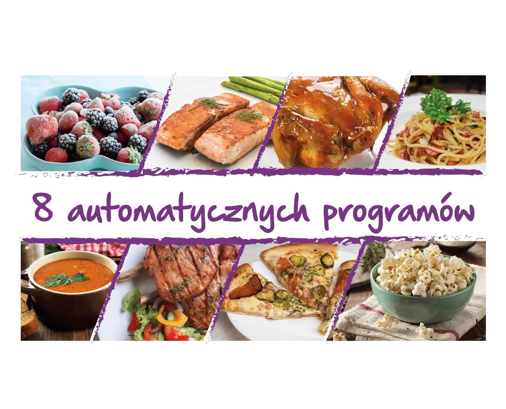 Programy automatyczne Osiem zdefiniowanych programów automatycznych ułatwi szybkie przygotowanie posiłku, bez potrzeby każdorazowego ustawiania parametrów podgrzewania. Możesz wybrać spomiędzy m.in.: podgrzewania, warzyw, ryby, pizzy czy makaronu. |