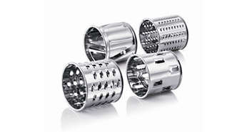 Dodatkowy pojemnik i 4 bębny do warzyw W zestawie bębny do tarcia (na grubo i na drobno), siekania i cięcia w kształty. |