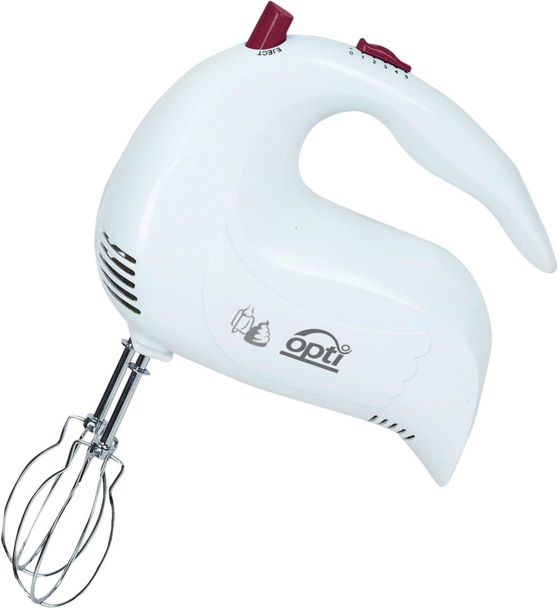 Mikser ręczny, RK-0241, marki Opti, o mocy 200 W, w kolorze białym. Urządzenie wyposażone zostało w 5 prędkości pracy, funkcję Turbo, a także ergonomiczny uchwyt. Model ten posiada również przycisk automatycznie zwalniający końcówki. Do miksera dołączone zostały końcówki wykonane ze stali nierdzewnej przeznaczone do mieszania i ubijania.