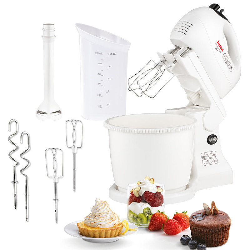 Mikser stojący marki Tefal o mocy 450 W, niezbędny dla każdej osoby, która lubi piec ciasta i ciasteczka. Pozwala na wykorzystanie 5 różnych prędkości, w zależności od rodzaju przygotowywanej potrawy. W razie potrzeby można też użyć funkcji turbo. W zestawie otrzymujemy 2 trzepaczki oraz 2 mieszadła, dzięki temu nadaje się zarówno do mieszania mąki z innymi składnikami, jak i do ubijania jajek. Przycisk eject ułatwia wymianę akcesoriów. Mikser jest praktyczny i wytrzymały, dzięki czemu można go używać przez długi okres czasu bez ryzyka awarii. Obrotowa misa o pojemności 2.5 l nie wymaga od użytkownika trzymania miksera w ręku, co sprawia, że urządzenie jest wygodniejsze od standardowych modeli. W zestawie otrzymujemy również praktyczną szpatułkę.