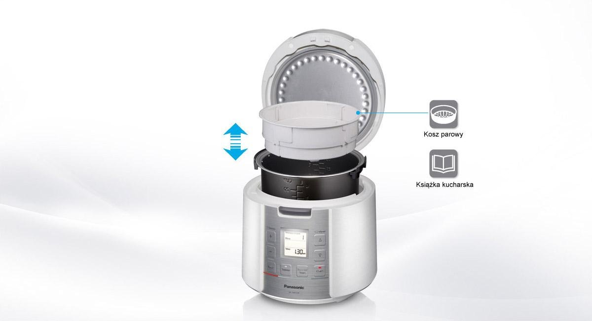 Oryginalny regulowany kosz parowy firmy Panasonic do wygodnego przyrządzania potraw na parze oraz książka kucharska w zestawie.