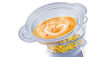 | Pojemnik do gotowania na parze XL — zupy, gulasz, ryż i nie tylko Dzięki pojemnikowi do gotowania na parze XL można przygotować bardziej urozmaicone, pyszne posiłki dla całej rodziny. Pojemnika można używać do przygotowania zup, gulaszu, ryżu i nie tylko. |
