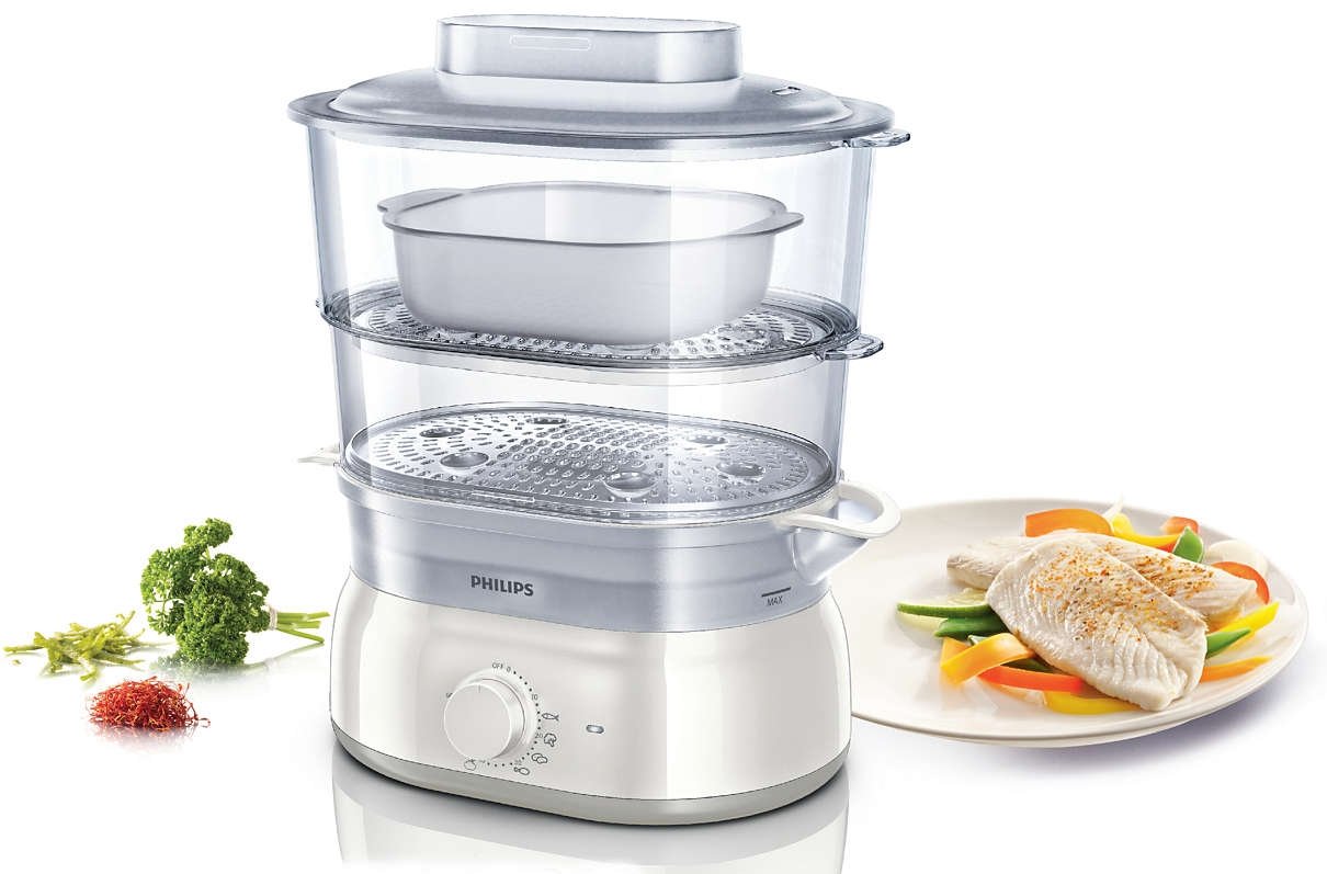 2 kosze umożliwiające gotowanie na parze kilku składników jednocześnie 2 kosze umożliwiające gotowanie na parze różnych składników w tym samym czasie. |