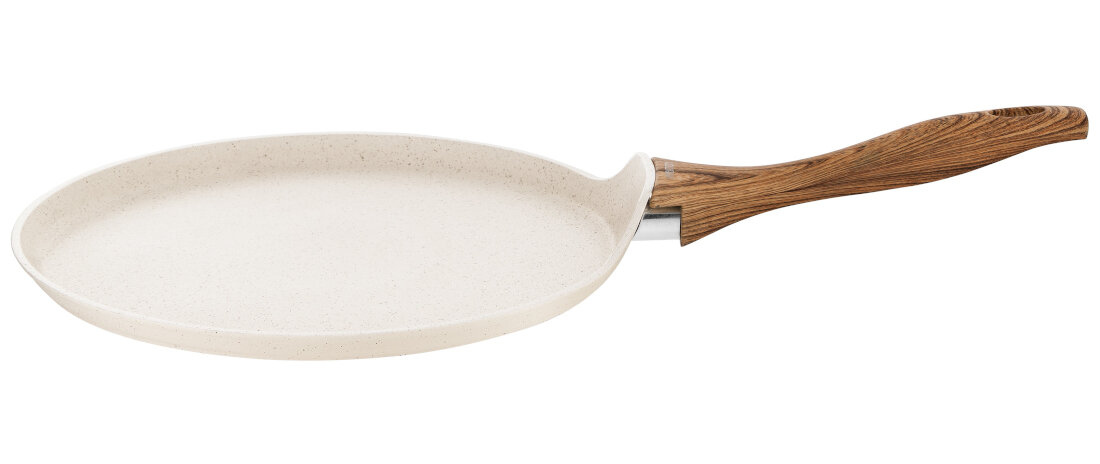 Wewnątrz pokryte powłoką nieprzywierającą o unikalnym wyglądzie imitującym kamień. Na zewnątrz pokryte odporną na wysokie temperatury powłoką o chropowatej powierzchni w tym samym kolorze co powłoka wewnątrz. Rączki pokryte są specjalnym materiałem Soft Touch przypominającym drewno, zapewniają pewne trzymanie w dłoni.