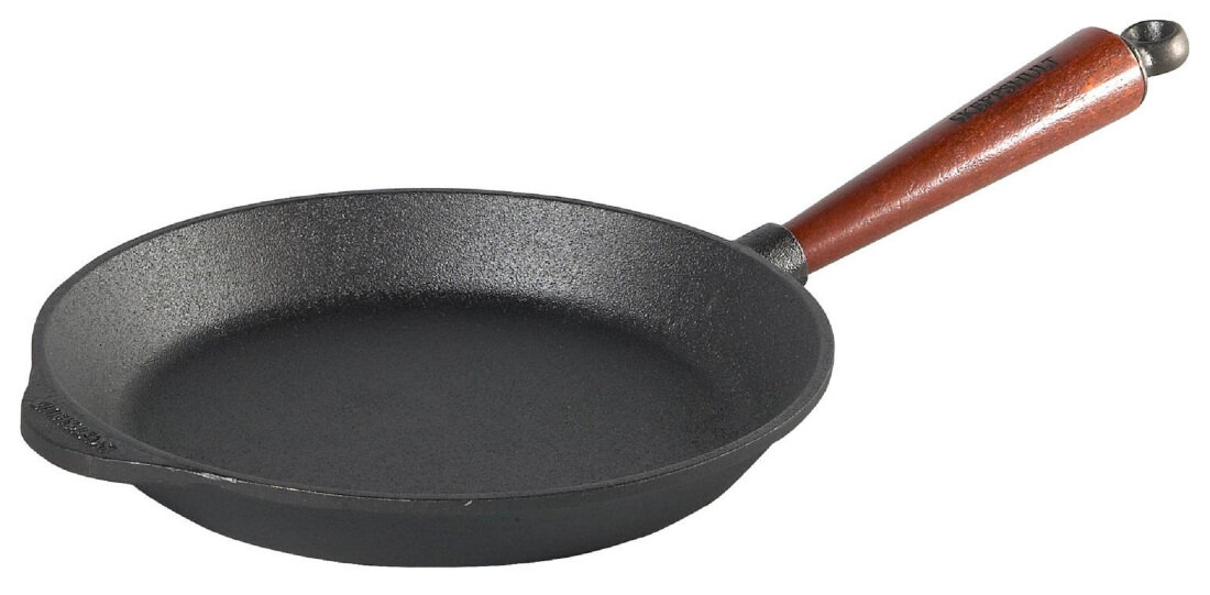 Patelnia SKEPPSHULT Natural Selection 0240T wykonana z żeliwa z drewnianą rączką. Należy ją jedynie opłukać bieżącą ciepłą wodą w celu usunięcia ewentualnego kurzu i pozostałych nieczystości mogących pojawić się podczas np. transportu lub magazynowania.