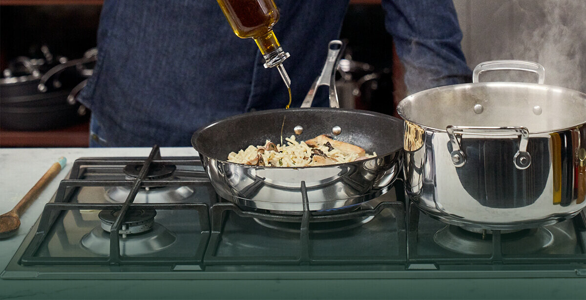 Uniwersalnych w zastosowaniu patelni Jamie Oliver Cook’s Direct można używać na każdym rodzaju kuchenek: gazowych, elektrycznych, ceramicznych czy indukcyjnych.