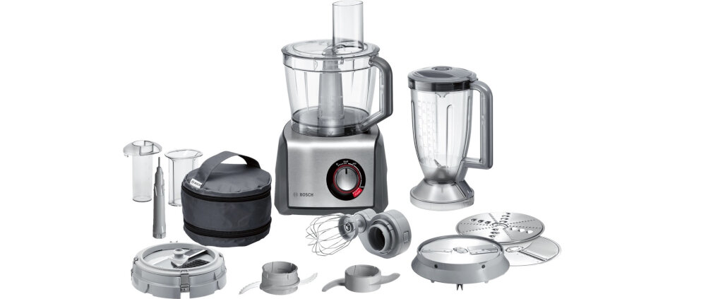 W wyposażeniu standardowym znajdują się między innymi: mikser kielichowy, tarcze tnące, trzepaczka i noże.