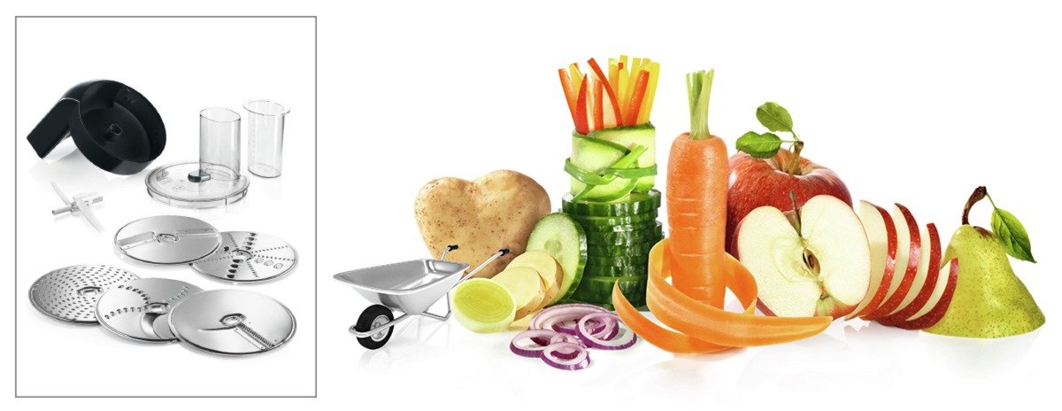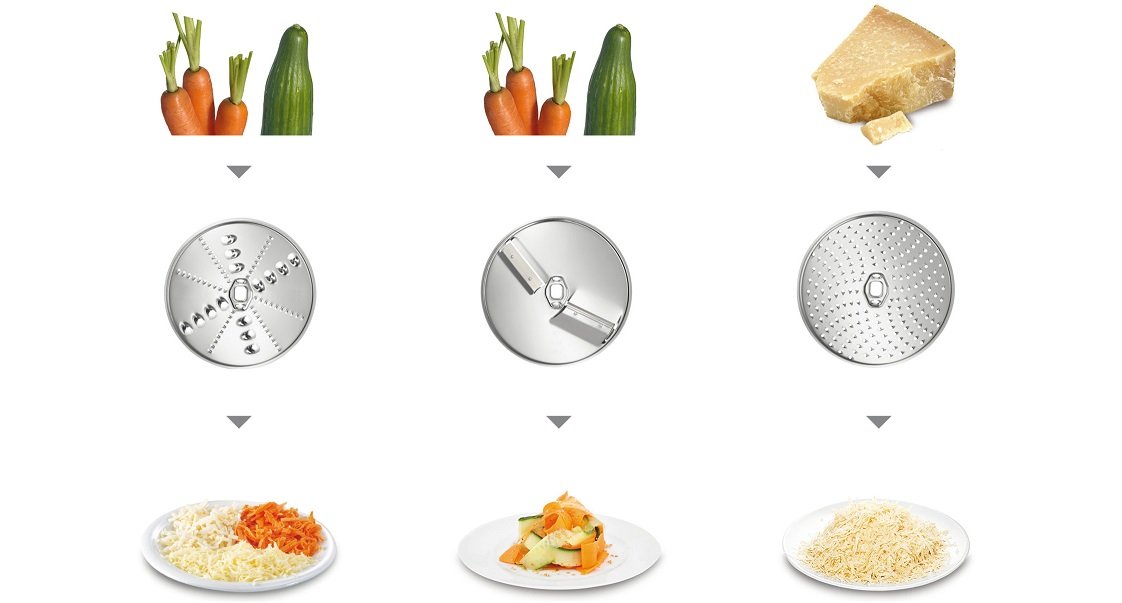 Wyjątkowo wszechstronny - szybkie i proste rozdrabnianie, tarcie oraz cięcie różnorodnych składników bezpośrednio do misy. Tarcze ze stali nierdzewnej zapewniają naturalny smak przygotowanej potrawy oraz są łatwe do czyszczenia. Tarcze standardowe (5 funkcji): dwustronna tarcza do krojenia na plasterki (grube i cienkie), dwustronna tarcza do krojenia na wiórki (grube i cienkie), tarcza do drobnego tarcia, np. czekolady.