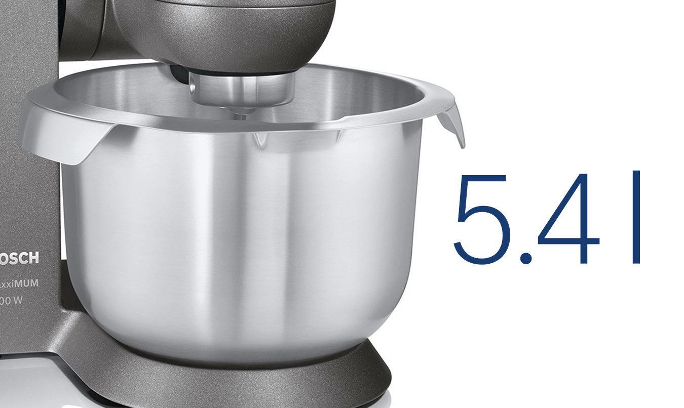 Bardzo duża misa ze stali szlachetnej o pojemności 5,4 l z dwoma wygodnymi oraz brzegiem ułatwiający opróżnianie zawartości pozwala pomieścić do 3,5 kg ciasta.