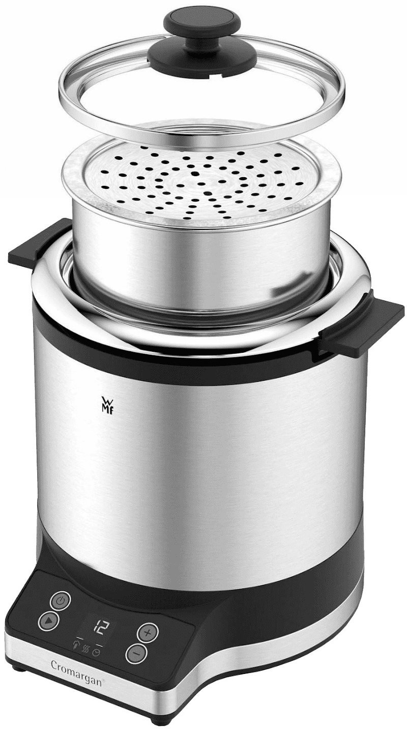 Wewnętrzny pojemnik z powłoką nieprzywierającą o pojemności ok 1L oraz dodatkowy pojemnik/przystawka do gotowania warzyw na parze - zostały wykonane ze stali nierdzewnej Cromargan® 18/10.