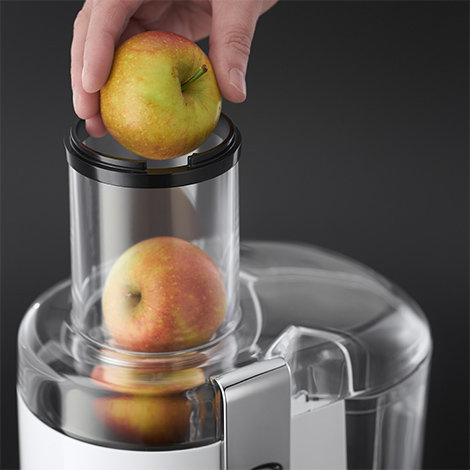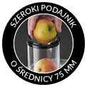 Szeroki podajnik o średnicy 75mm umożliwia wkładanie owoców w całości