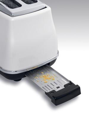 Toster wyposażony został w wyjmowaną tackę na okruszki, dzięki czemu masz pewność, że jego wnętrze jest zawsze czyste. Okruchy z opiekanego pieczywa spadają bezpośrednio na tackę, którą łatwo jest wyjąć i wyczyścić, zatem czyszczenie jest wygodne i nie zabiera wiele czasu. Dodatkowo, aby podnieść komfort użytkowania, toster posiada antypoślizgowe nóżki i zwijany w podstawie kabel zasilający.