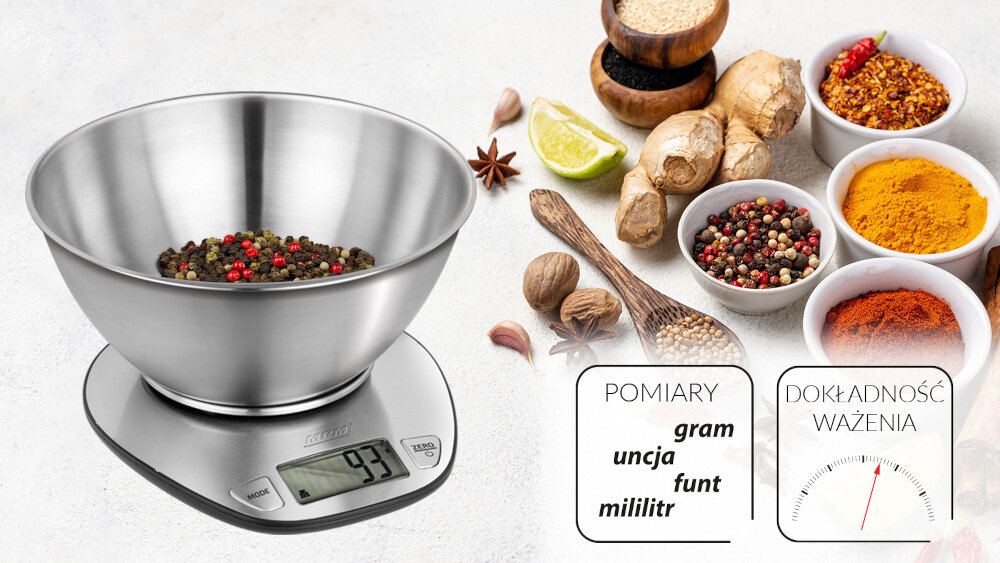 Waga kuchenna MWK-05M to niezastąpione narzędzie w kuchni, które wspiera zarówno zdrowy styl życia, jak i kreatywne podejście do gotowania. Dzięki precyzyjnemu odmierzaniu składników w kilku jednostkach wagi możesz przyrządzać wyszukane potrawy, także orientalne i za każdym razem osiągać doskonałe rezultaty kulinarne, kontrolując jakość i ilość spożywanych posiłków.