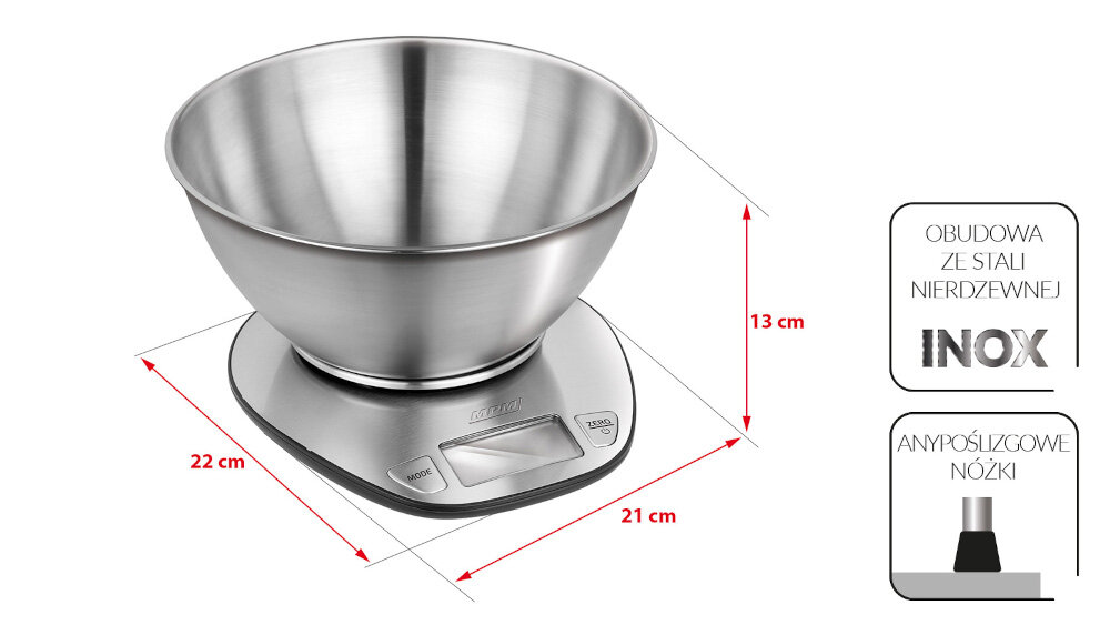 Waga kuchenna MWK-05M jest wykonana ze stali nierdzewnej. Jej kompaktowe wymiary sprawiają, ze swobodnie zmieści się na każdym blacie kuchennym. Waga do żywności jest wszechstronnym narzędziem, które można wykorzystać zarówno podczas gotowania, pieczenia, jak i podczas przygotowywania przekąsek, a nawet do odmierzania porcji podczas planowania posiłków na podróż. Model wyposażony jest w gumowe antypoślizgowe nóżki, dzięki czemu ulokujesz go stabilni na blacie kuchennym.
