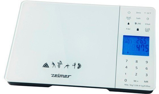 Elektroniczna waga dietetyczna, KS1700 marki Zelmer, o maksymalnym załadunku wynoszącym 5000 g i dokładności 1 g. Urządzenie wyposażone zostało w wyświetlacz LCD, automatyczną kalibrację, alarm czasowy, a także funkcję tarowania. Zaletą produktu jest możliwość pamięci dla 99 produktów, dotykowe sterowanie i funkcja automatycznego włączania i wyłączania. Istnieje możliwość zmiany jednostek z gramów na uncje czy funty. Antypoślizgowe nóżki zapewniają stabilność produktu podczas użytkowania. Waga zasilana jest za pomocą baterii typu AAA.