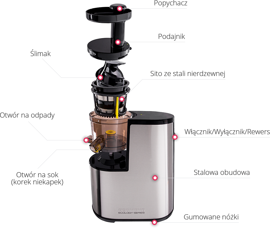 Funkcje: Funkcja reverse, Wyjmowany zbiornik na miąższ, Pojemnik na sok