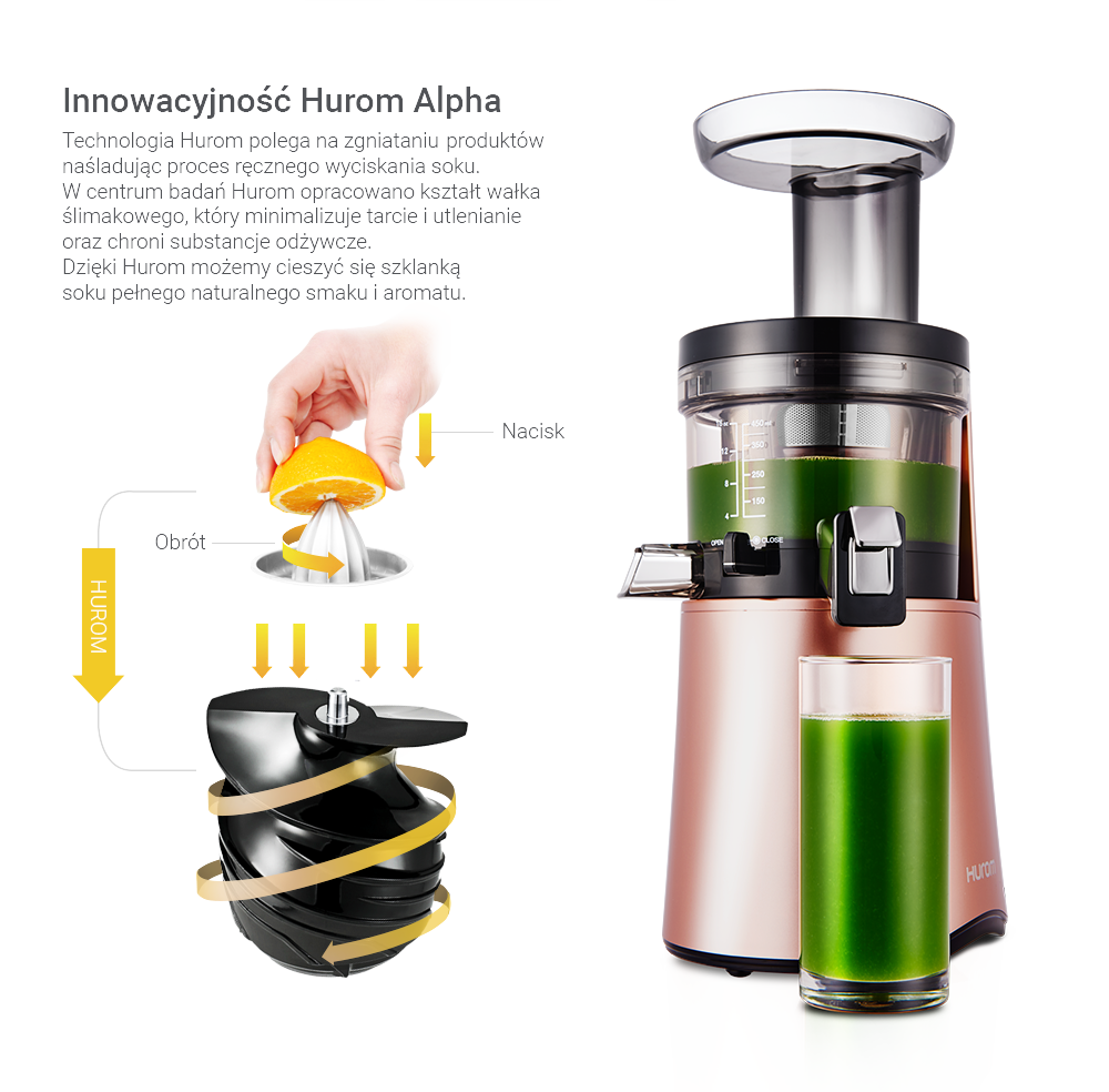 Opatentowany system wolnoobrotowego wyciskania zapewnia świeżość soku oraz najwyższą wartość odżywczą. |