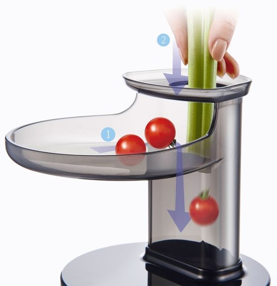 1. Do bocznego otworu włóż okrągłe składniki, takie jak winogrona, pomidorki cherry i jagody oraz większe składniki. 2. Długie składniki, takie jak warzywa liściaste, marchewki i ogórki włóż do górnego otworu. |