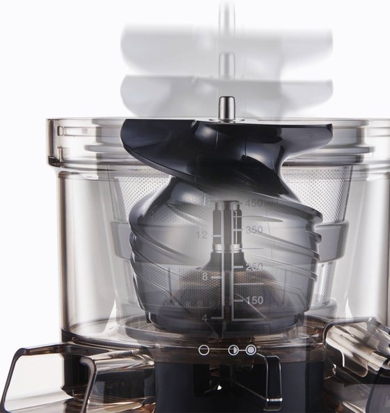 Transparentna misa Dzięki przezroczystej misie i półprzezroczystej komorze wsadowej użytkownik może obserwować proces, zmieniając ustawienia aby wydobyć jak najwięcej soku. |
