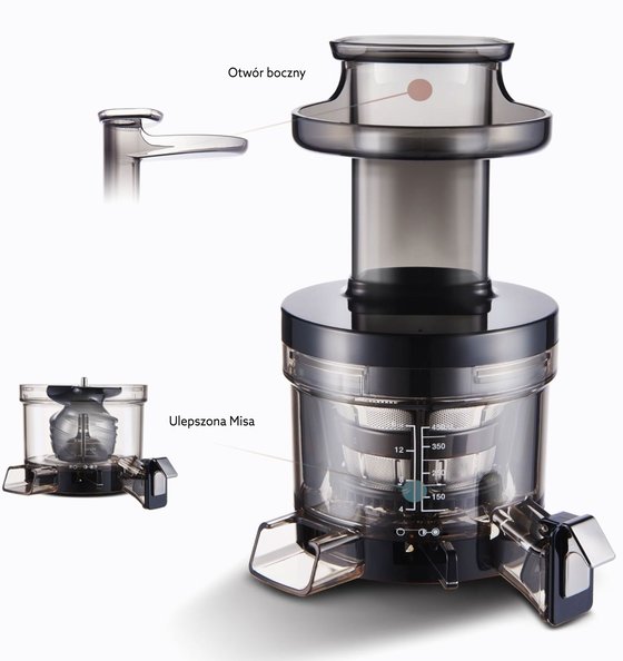 | Komora Alpha Plus Nowy otwór boczny Alpha plus to wygodniejszy i szybszy proces wyciskania soku z warzyw i owoców. Zintegrowana współpraca poszczególnych części wyciskarki wraz z ulepszoną konstrukcją misy sprawia, że montaż jest banalnie prosty, a moment obrotowy wałka ślimakowego spowolniony do minimum. Wszystko to umożliwia stabilne wyciskanie wysokiej jakości soków. |