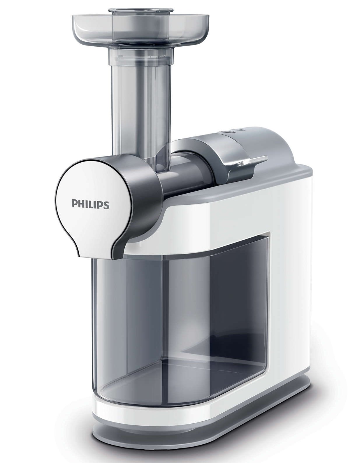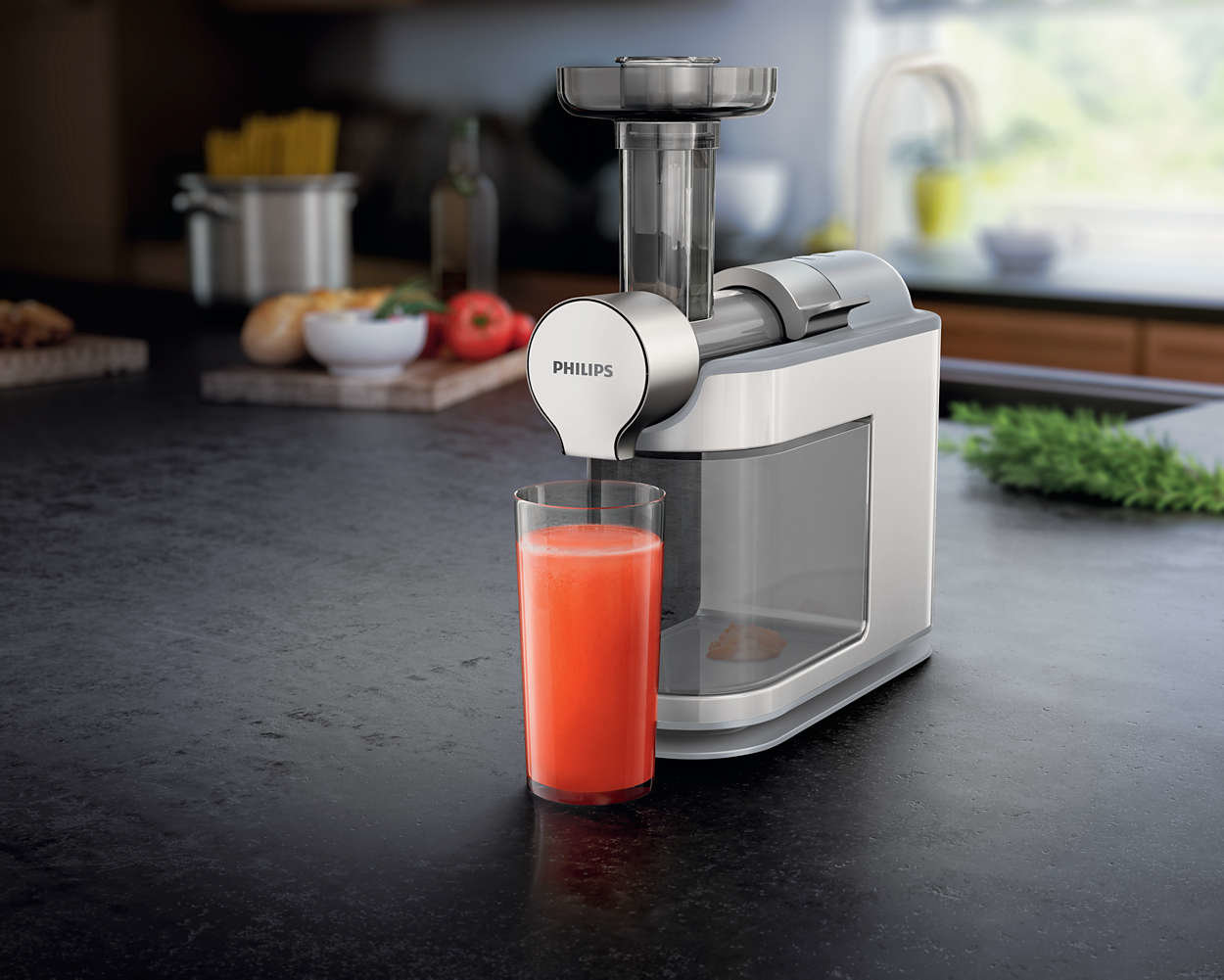 | Wyciskaj sok ze swoich ulubionych owoców, w tym z bananów i mango Przyrządzaj smaczne i zdrowe soki z miękkich owoców i twardych warzyw. Możesz wyciskać sok ze swoich ulubionych składników — nawet tych o wysokiej zawartości skrobi, takich jak banany i mango. |