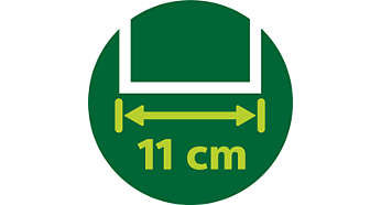 | Wąskie urządzenie ze zintegrowanymi elementami Zoptymalizowana konstrukcja o szerokości 11 cm pozwala na umieszczenie urządzenia na blacie, gdzie zawsze będzie gotowe do pracy. Podczas przechowywania również zajmuje mało miejsca, ponieważ jest w pełni zintegrowane. Dzięki temu nie potrzeba zewnętrznych pojemników podczas wyciskania. |