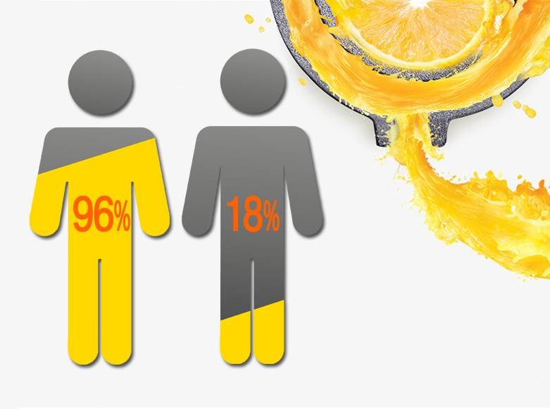 | Przyswajalność witamin Witaminy zawarte w soku wyciśniętym w wyciskarce wolnoobrotowej ludzki organizm przyswaja w nawet w 96% po około 15 minutach, surowe warzywa są przyswajane w około 18% po 4-5 godzinach. |