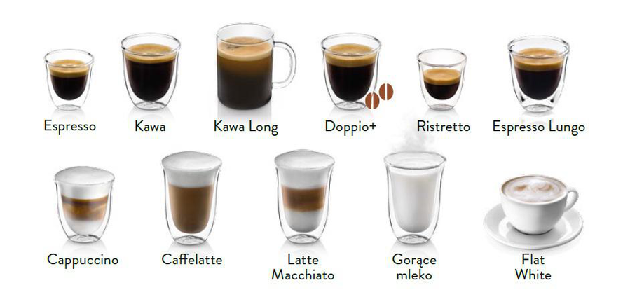 Dostępne napoje: | Cappuccino, Espresso, Kawa czarna, Latte, Latte Macchiato, Lungo, Ristretto |