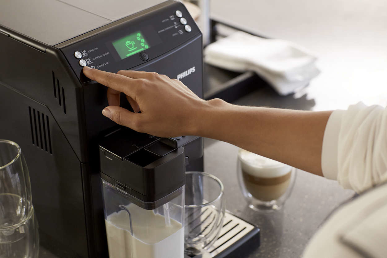 | Kremowe cappuccino za jednym dotknięciem dzięki zintegrowanemu pojemnikowi na mleko Ciesz się kremowym cappuccino o idealnej temperaturze w najprostszy sposób. Wystarczy wlać mleko do pojemnika, podłączyć pojemnik do ekspresu i wybrać rodzaj napoju. Niezależnie od tego, czy wybierzesz cappuccino czy spienione mleko, napój będzie gotowy w kilka sekund bez rozpryskiwania i w idealnej temperaturze. |
