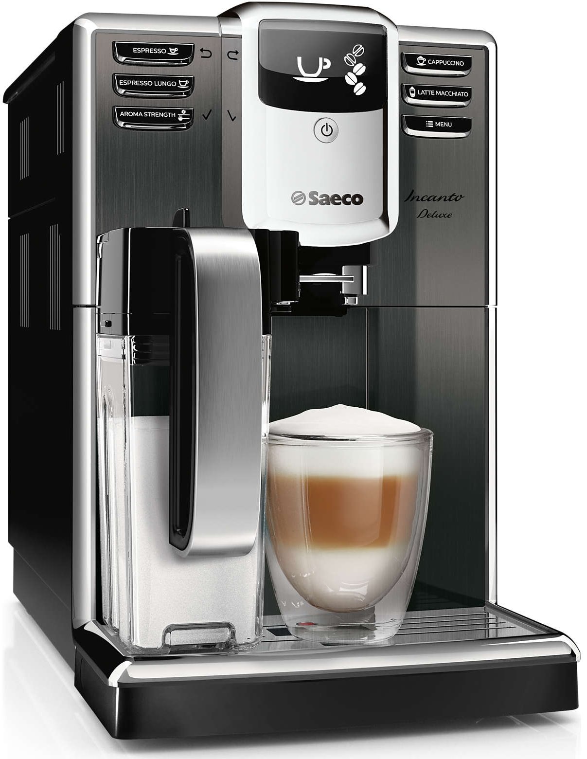 Ręcznie wykonana wersja limitowana, tytanowa stal szlachetna Każdy najmniejszy szczegół tego ekspresu został zaprojektowany i wykonany z myślą o najwyższej jakości. Panel przedni z czystej stali szlachetnej, czytelny wyświetlacz i przyjemne w dotyku przyciski stanowią doskonałą harmonię elegancji, intuicyjności i włoskiego kunsztu. Ekspres Saeco Incanto Deluxe będzie przez wiele lat ozdobą każdej nowoczesnej lub tradycyjnej kuchni. |