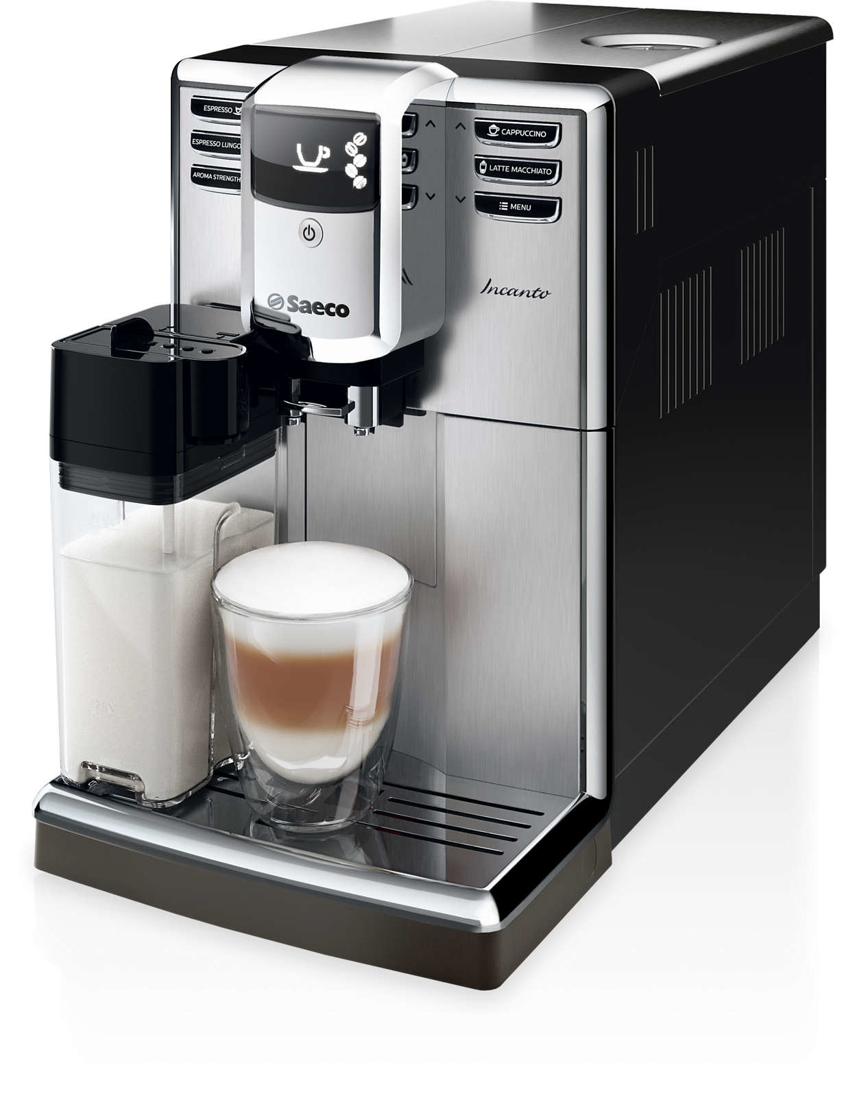 | Elegancki wygląd. Rewelacyjna jakość kawy. Wyśmienite latte macchiato za dotknięciem przycisku - 6 rodzajów napojów - Zintegrowany pojemnik na mleko - Stal szlachetna - AquaClean |