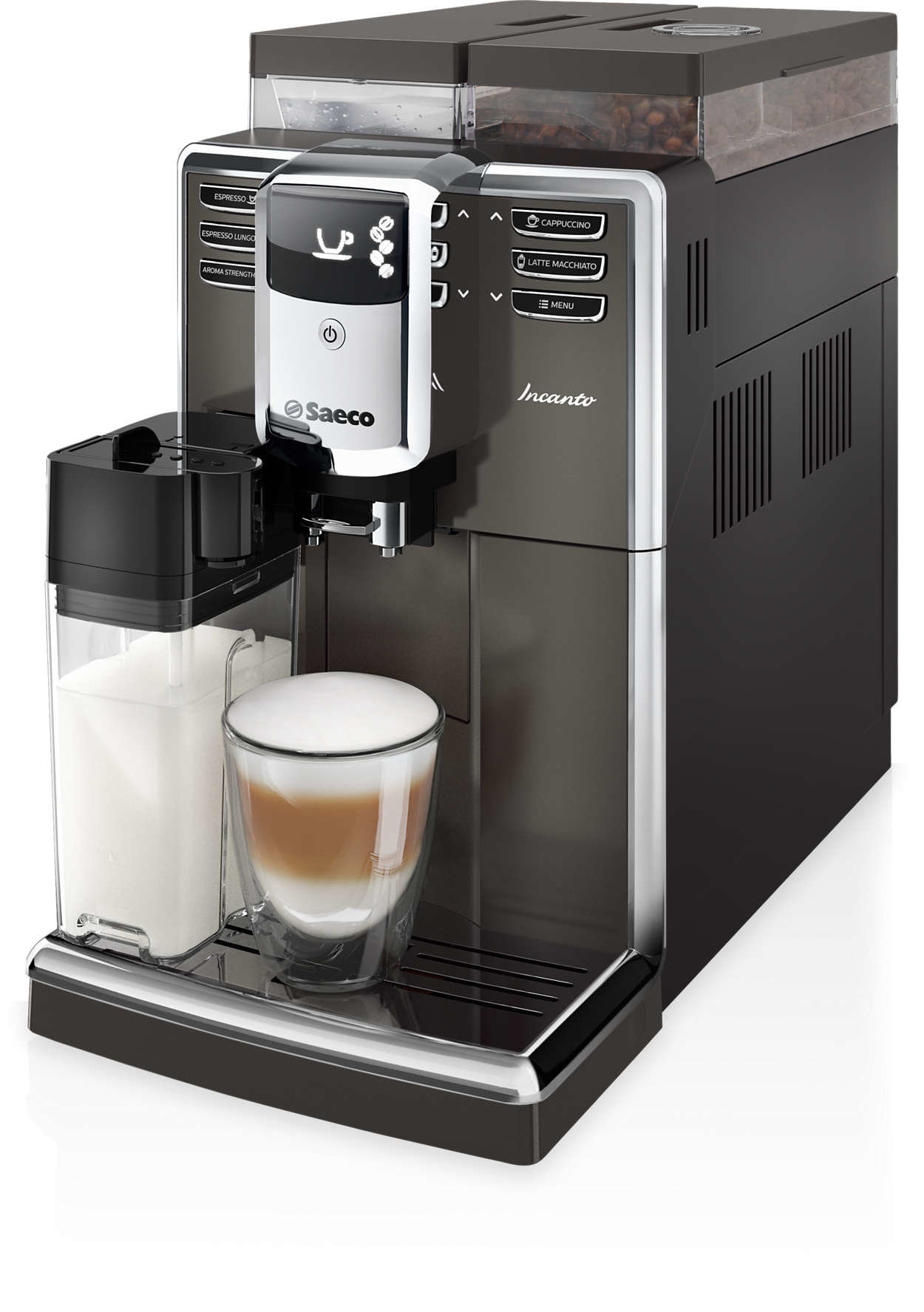 | Elegancki wygląd. Rewelacyjna jakość kawy. Wyśmienite latte macchiato za dotknięciem przycisku - 6 rodzajów napojów - Zintegrowany pojemnik na mleko - Tytanowy - AquaClean |
