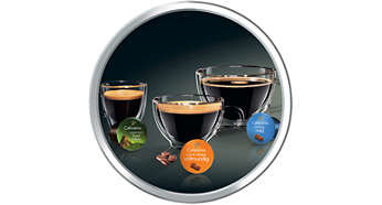 | Różne rodzaje kawy na wyciągnięcie ręki Trzy odsłony przyjemności (espresso, caffè crema i kawa przelewowa) dzięki opatentowanemu systemowi parzenia, który automatycznie dobiera odpowiednie ciśnienie: najwyższe do espresso, średnie do caffè crema i niskie do kawy przelewowej. Ekspresy Cafissimo umożliwiają parzenie mocnego espresso i łagodniejszej caffè crema, jak również czarnej kawy przelewowa — wystarczy jedno urządzenie, aby można było delektować się ulubioną kawą o dowolnej porze dnia. |