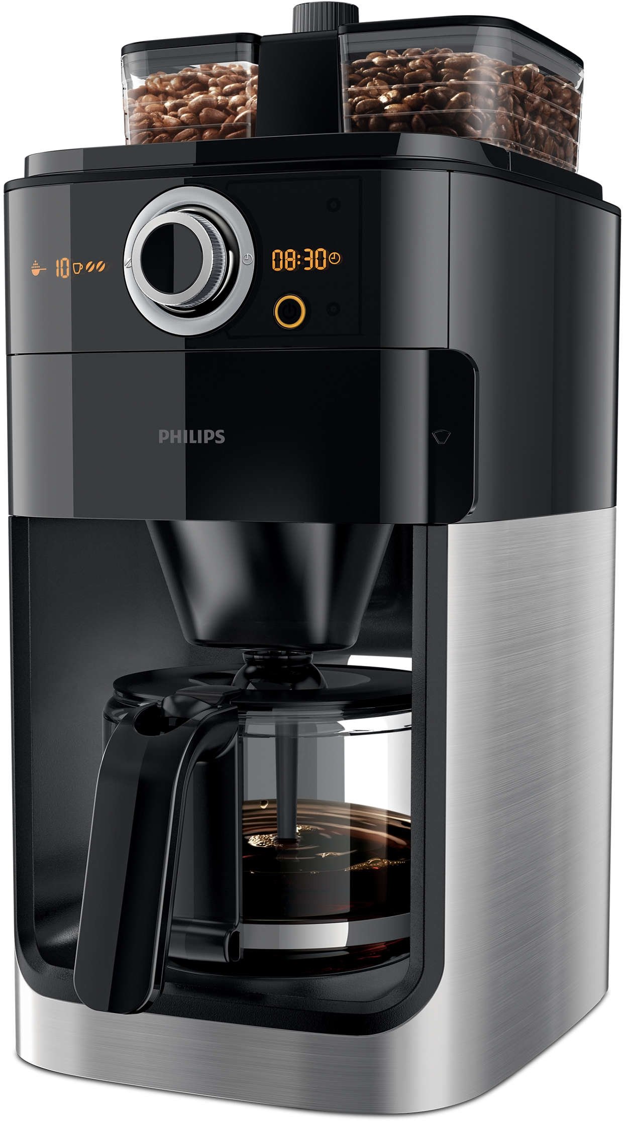 | Zmieniaj i mieszaj ziarna tak, jak lubisz! Jedyny ekspres Grind & Brew z dwoma pojemnikami na ziarna kawy -Ze szklanym dzbankiem -Wbudowany młynek do kawy -Czarny, metalowy -Z zegarem |