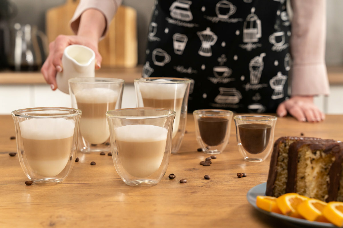 W zestawie szklanek GÖTZE&JENSEN GA600 znajdują się 2 szklanki do espresso 60 ml, 2 szklanki do cappuccino 190 ml oraz 2 szklanki do latte macchiato 220 ml.