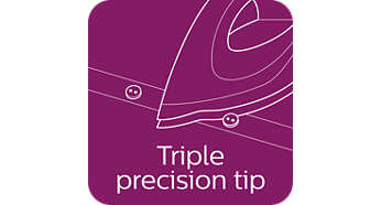 Końcówka Triple Precision ułatwiająca prasowanie trudno dostępnych miejsc Końcówka stożka parowego tego żelazka Philips jest precyzyjna na 3 sposoby: ma spiczastą końcówkę, rowek do prasowania wokół guzików oraz gładki ksztalt. Końcówka Triple Precision pozwala dotrzeć nawet do najtrudniej dostępnych miejsc, m.in. obszaru wokół guzików oraz pomiędzy plisami. |